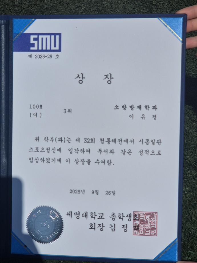 본문 시작 홈으로 커뮤니티 학과소개 교수소개 전공과정 커뮤니티 홈페이지가이드 학과행사 학과공지 채용정보 학사일정 학과행사 동아리 소방방재학과의 자랑 궁금합니다 수험생 Q&A 학과행사 페이스북 트위터 프린트 2025학년도 제32회 청룡체전 소방방재학과 소방방재학과 57 2025-09-23 2025년 9월 23일 ~9월 25일 제32회 청룡체전 기간동안 여자 피구, 남자 축구, 남자 농구, 혼성 계주, 여자 100m, 남자 100m 참가하였습니다. 선수분들 모두 수고하셨고, 응원해주신 학우분들 감사드립니다! 목록 이전KICT 화재안전연구소 견학 담당부서 : 소방방재학과 담당자 : 소방방재학과 연락처 : 043-649-1787 최종수정일 : 2024-10-26 만족도조사 만족도 조사 이 페이지에서 제공하는 정보에 대하여 만족하시나요? 매우만족 만족 보통 불만족 매우불만족