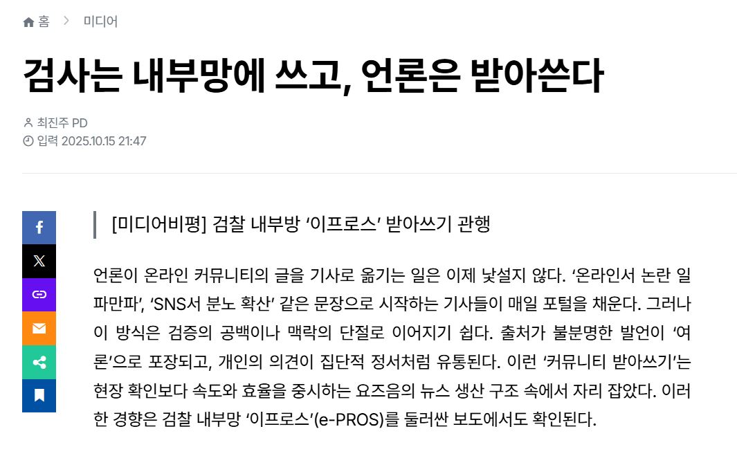 언론이 온라인 커뮤니티의 글을 기사로 옮기는 일은 이제 낯설지 않다. ‘온라인서 논란 일파만파’, ‘SNS서 분노 확산’ 같은 문장으로 시작하는 기사들이 매일 포털을 채운다. 그러나 이 방식은 검증의 공백이나 맥락의 단절로 이어지기 쉽다. 출처가 불분명한 발언이 ‘여론’으로 포장되고, 개인의 의견이 집단적 정서처럼 유통된다. 이런 ‘커뮤니티 받아쓰기’는 현장 확인보다 속도와 효율을 중시하는 요즈음의 뉴스 생산 구조 속에서 자리 잡았다. 이러한 경향은 검찰 내부망 ‘이프로스’(e-PROS)를 둘러싼 보도에서도 확인된다.