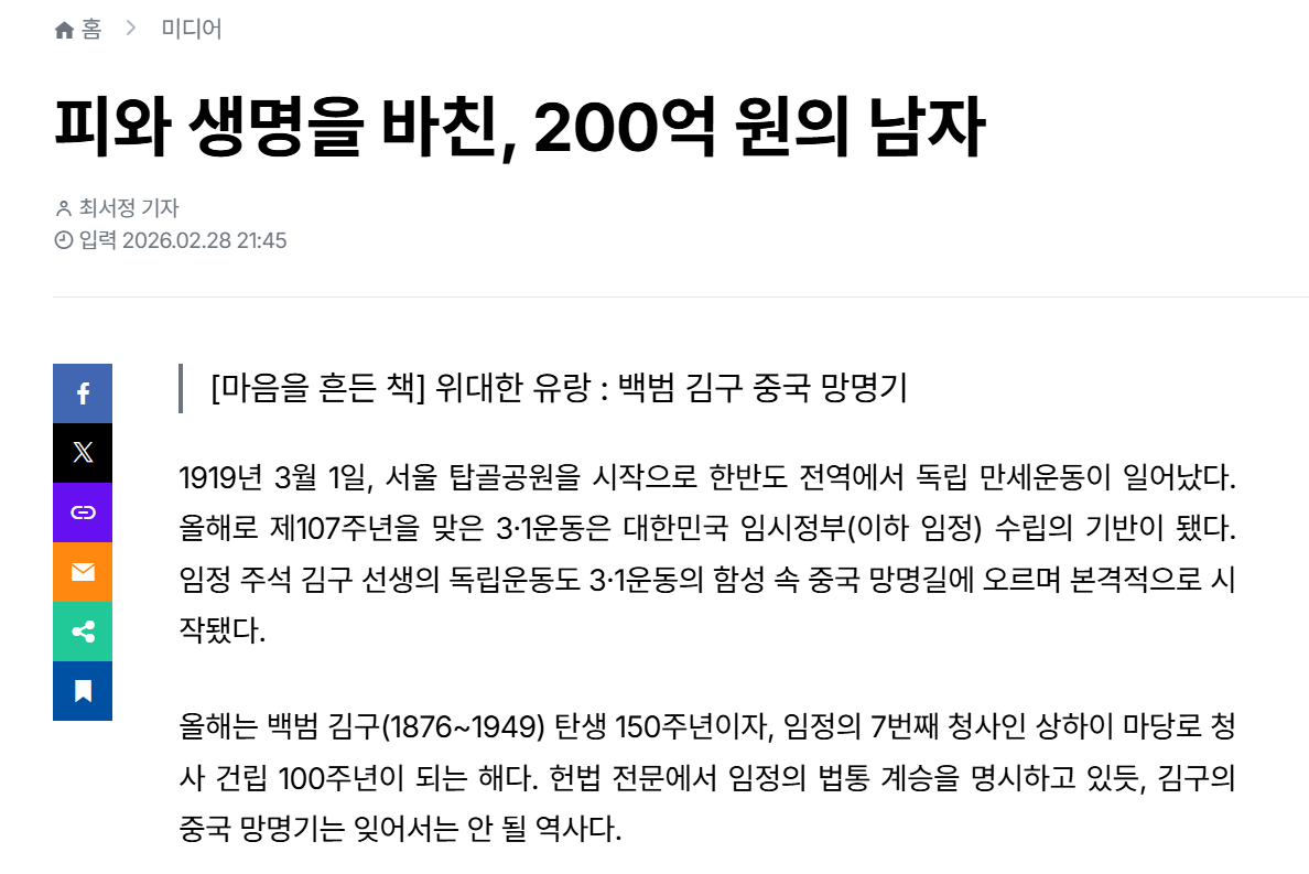 1919년 3월 1일, 서울 탑골공원을 시작으로 한반도 전역에서 독립 만세운동이 일어났다. 올해로 제107주년을 맞은 3·1운동은 대한민국 임시정부(이하 임정) 수립의 기반이 됐다. 임정 주석 김구 선생의 독립운동도 3·1운동의 함성 속 중국 망명길에 오르며 본격적으로 시작됐다. 올해는 백범 김구(1876~1949) 탄생 150주년이자, 임정의 7번째 청사인 상하이 마당로 청사 건립 100주년이 되는 해다. 헌법 전문에서 임정의 법통 계승을 명시하고 있듯, 김구의 중국 망명기는 잊어서는 안 될 역사다.