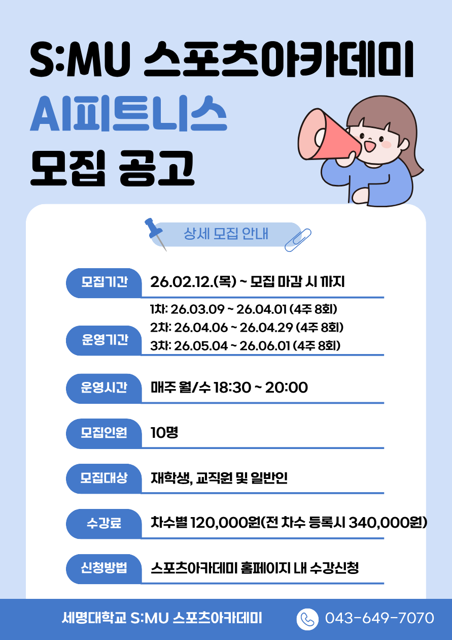 본문 시작 홈으로 공지사항 SM:U 스포츠 아카데미 공지사항 수강신청 Q&A 홈페이지가이드 공지사항 공지사항 공지사항 페이스북 트위터 프린트 -AI피트니스- 2026학년도 상반기 수강생 모집 안내 S:MU 스포츠 아카데미 조회 : 239 등록일 : 2026-02-11 론픽 장비 설명.pdf ( 920 kb) ?atchFileId=FILE_000000000235558&fileSn=0 론픽 장비 설명.pdf AI가 설계하는 나만의 트레이닝, AI피트니스 (자세한 기구 설명은 첨부파일을 확인해주세요!) 💛많은 관심과 참여 부탁드립니다.💛 참여를 원하신다면 여기를 클릭해주세요!🖱️ 목록 이전-순환운동교실- 2026학년도 상반기 수강생 모집 안내 다음 -요가&필라테스- 2026학년도 상반기 수강생 모집 안내 만족도조사 만족도 조사 이 페이지에서 제공하는 정보에 대하여 만족하시나요? 매우만족 만족 보통 불만족 매우불만족