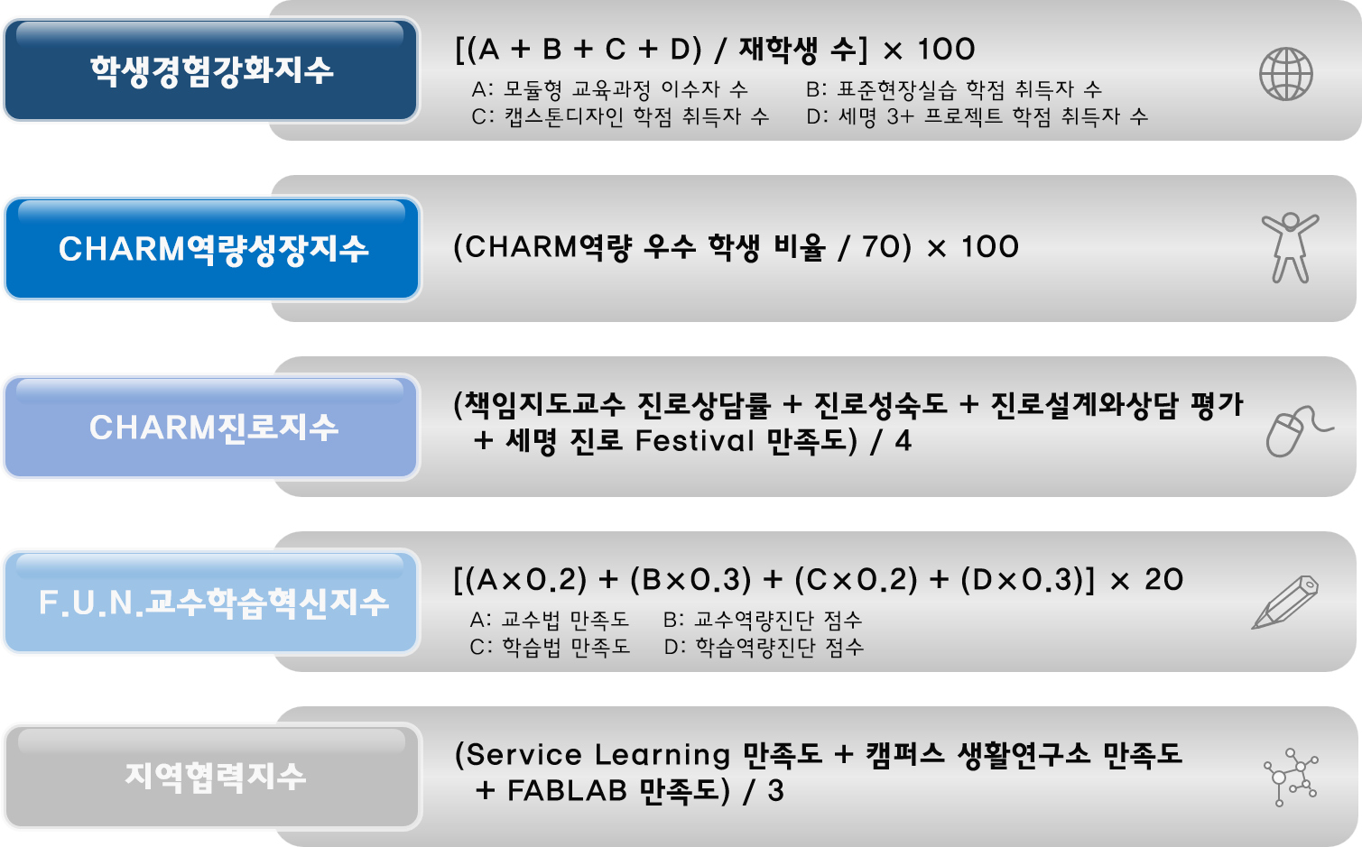 본문 시작 홈으로 성과관리 자율지표 자율지표 사업단소개 프로그램소개 성과관리 커뮤니티 홈페이지가이드 자율지표 핵심지표 자율지표 자율지표 페이스북 트위터 프린트 담당부서 : 대학혁신지원단 담당자 : - 연락처 : 043-649-7532 최종수정일 : 2025-10-16 만족도조사 만족도 조사 이 페이지에서 제공하는 정보에 대하여 만족하시나요? 매우만족 만족 보통 불만족 매우불만족