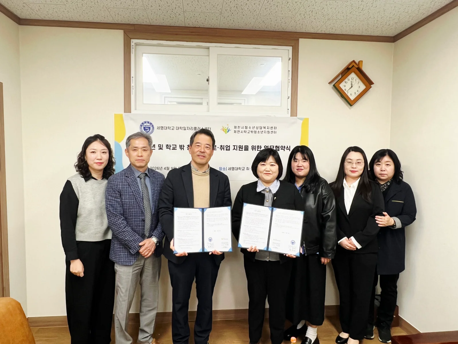 세명대학교 대학일자리플러스센터 황형서 처장은 “이번 업무협약은 지역청년과 학교 밖 청소년의 진로설계와 취업지원을 보다 체계적으로 연계하기 위한 뜻깊은 출발점”이라며 “앞으로도 지역 유관기관과의 긴밀한 협력을 바탕으로 청년 맞춤형 고용서비스와 진로지원 프로그램을 지속적으로 확대해 나가겠다.”고 밝혔다.