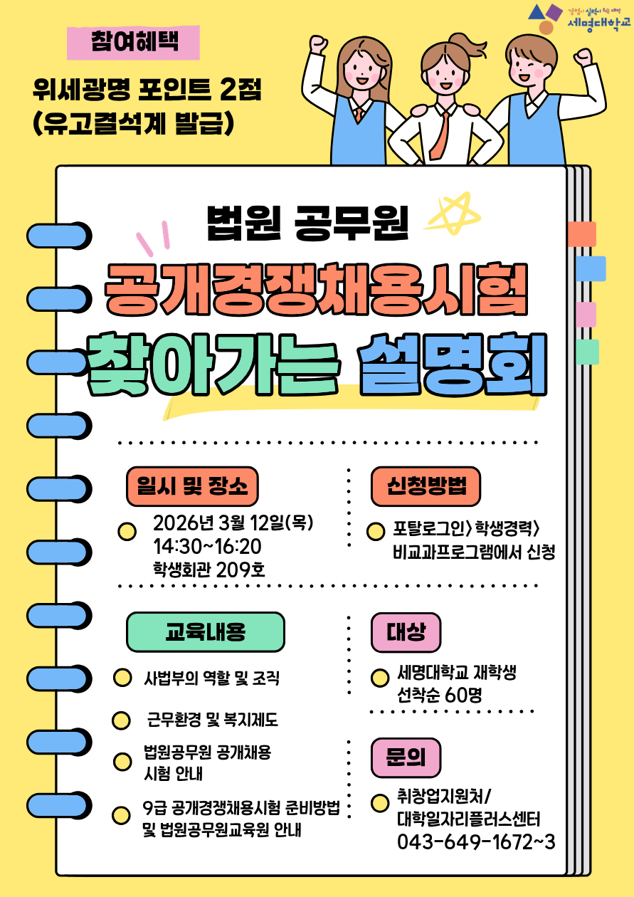 본문 시작 홈으로 커뮤니티 학과소개 학과과정 대학원 커뮤니티 연구동아리 홈페이지가이드 학과공지 학과공지 채용정보 학과일정 포토갤러리 유튜브 인스타그램 취업현황 학생회 조직도 졸업생 숏터뷰 학과공지 페이스북 트위터 프린트 법원 공무원 관련 "찾아가는 설명회" 바이오코스메틱학과 조회 : 22 등록일 : 2026-02-19 ◎ 참여혜택: 위세광명 포인트 각 2점, 유고결석계 발급(프로그램 이수 후 만족도 조사 완료자에 한함) ◎ 신청방법: 포털 시스템 > 학생경력 > 비교과프로그램에서 신청(신청 ☞바로가기 클릭) ◎ 문의: 취창업지원처 진로취업지원팀 043-649-1672/1673 목록 이전7개대학연합 2025 대학혁신지원사업 우수사례 성과포럼 안내 담당부서 : 바이오코스메틱학과 담당자 : - 연락처 : 043-649-1638 최종수정일 : 2024-10-26 만족도조사 만족도 조사 이 페이지에서 제공하는 정보에 대하여 만족하시나요? 매우만족 만족 보통 불만족 매우불만족