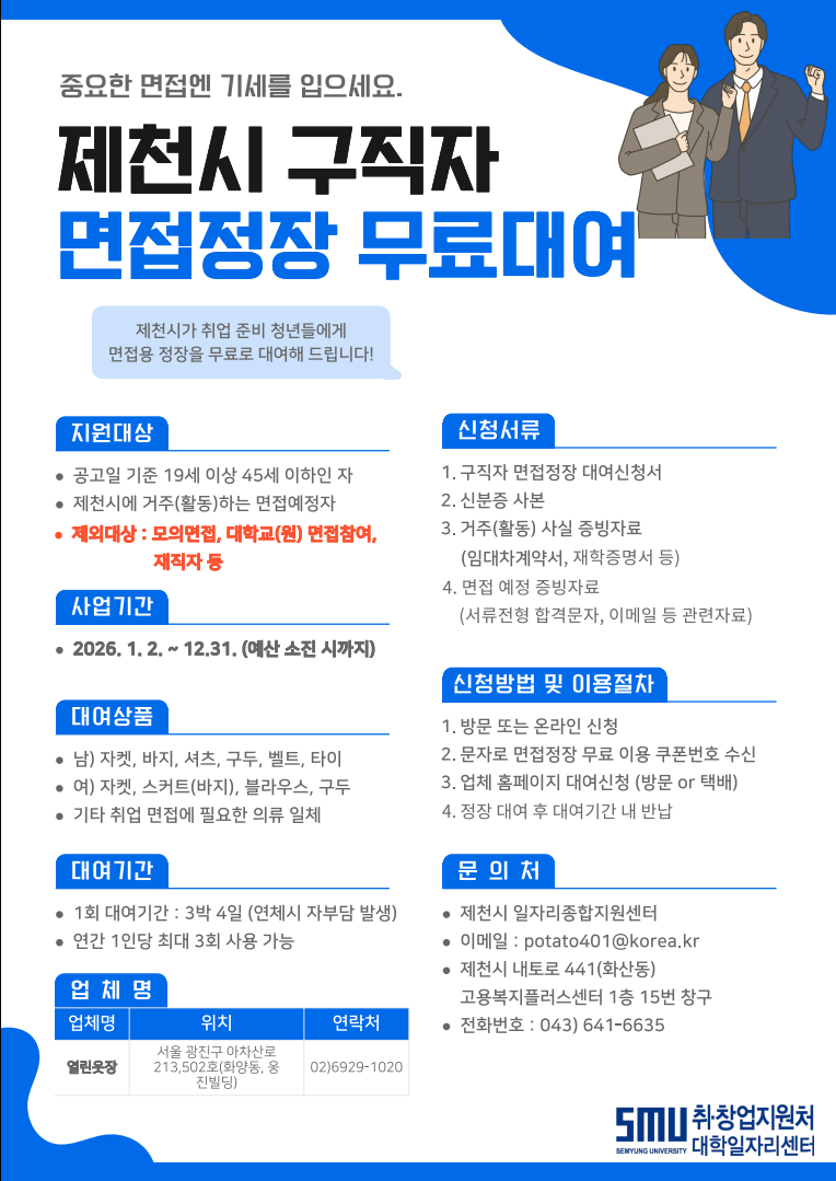본문 시작 홈으로 커뮤니티 학과소개 학과과정 대학원 커뮤니티 연구동아리 홈페이지가이드 학과공지 학과공지 채용정보 학과일정 포토갤러리 유튜브 인스타그램 취업현황 학생회 조직도 졸업생 숏터뷰 학과공지 페이스북 트위터 프린트 제천시 구직자 면접정장 무료대여 바이오코스메틱학과 조회 : 99 등록일 : 2026-04-16 목록 이전2026년 충북 PRIDE 공유대학 표준현장실습 및 취업박람회 홍보 담당부서 : 바이오코스메틱학과 담당자 : - 연락처 : 043-649-1638 최종수정일 : 2024-10-26 만족도조사 만족도 조사 이 페이지에서 제공하는 정보에 대하여 만족하시나요? 매우만족 만족 보통 불만족 매우불만족